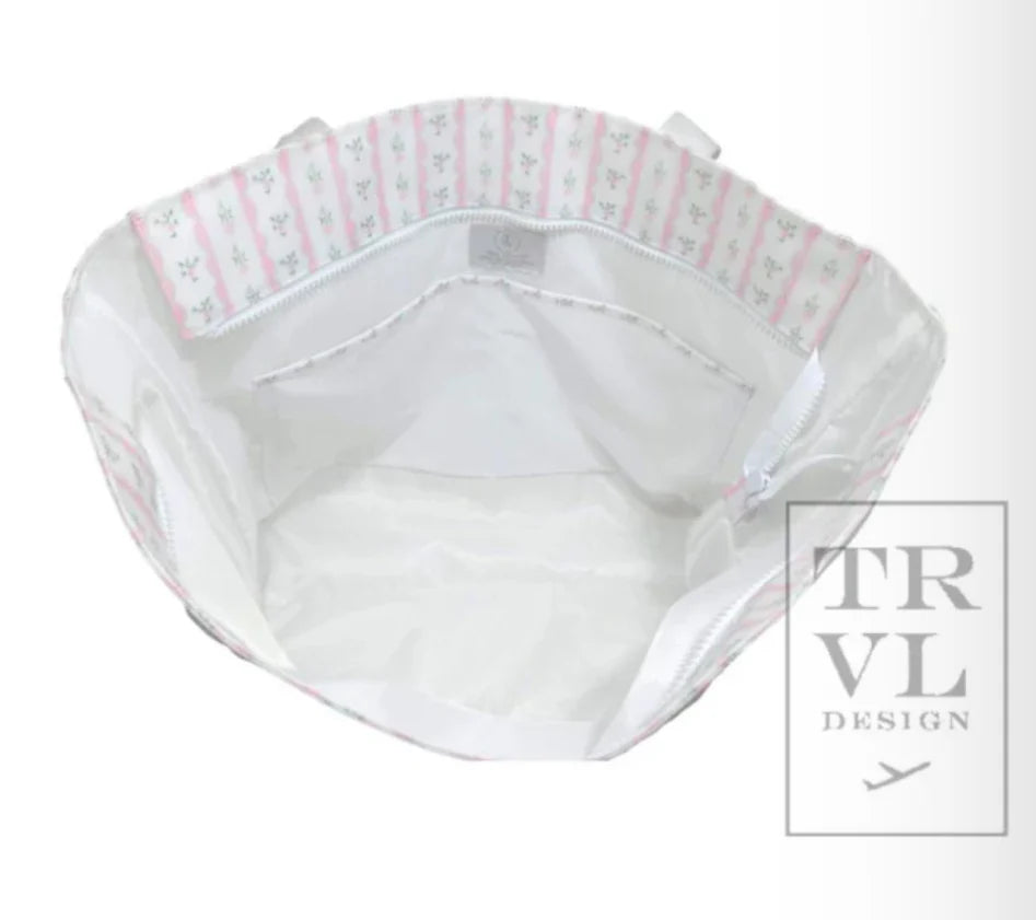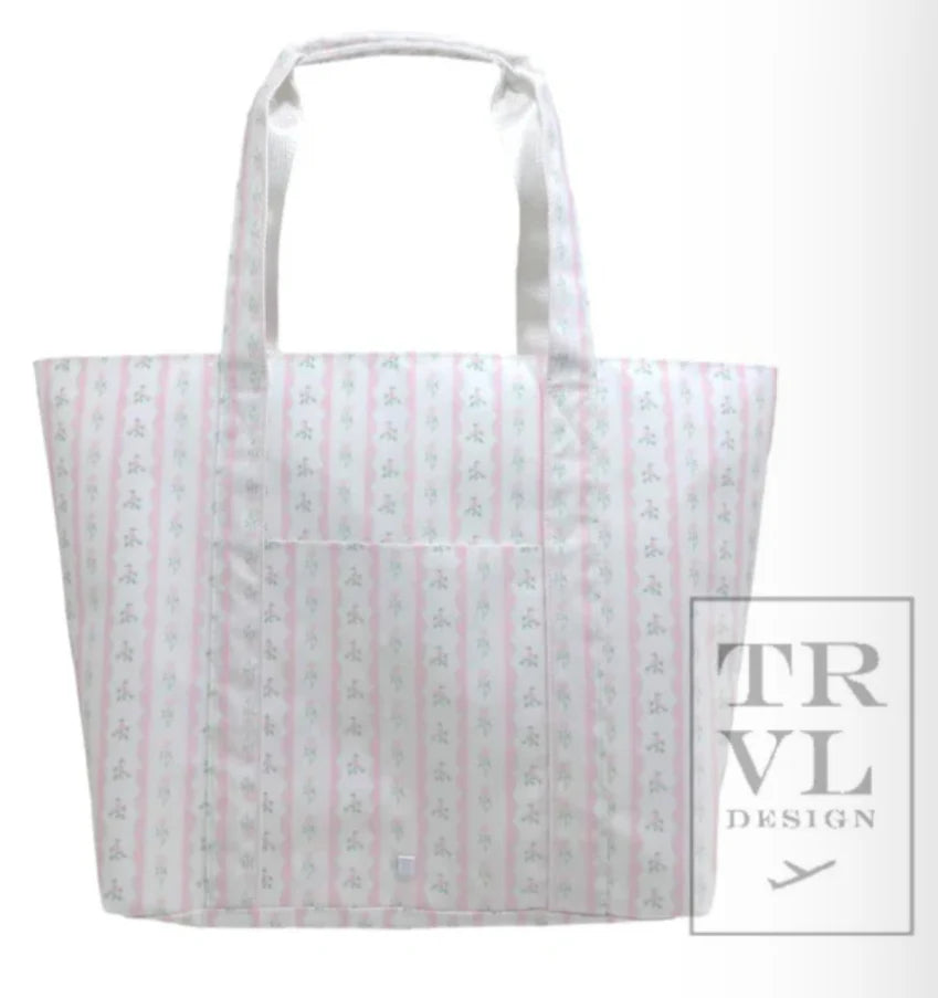 Get around effortlessly with our new Jumbo Tote. This do-it-all lightweight tote is useful year-round for all occasions: as a beach bag or for your everyday needs. Underneath the strap is satin webbing designed to prevent from slipping, an interior full slip pocket and zip pocket, a front exterior pocket, and an exterior trolley passthrough.