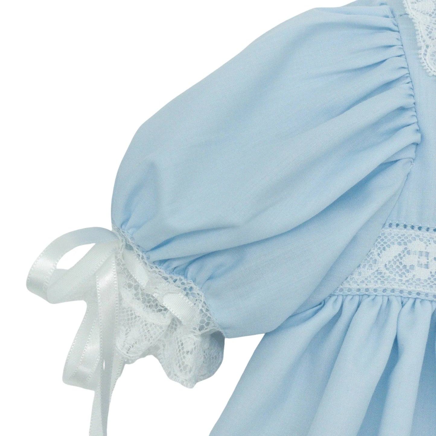 Experience the elegance and charm of our Constance Blue Heirloom Dress! Perfect for church events, portraits, and special occasions, this gorgeous dress features white lace puff sleeves and three rows of insertion lace at the hem. The delicate details, including satin ribbon ties, make this dress a true heirloom piece that your little girl will love.
