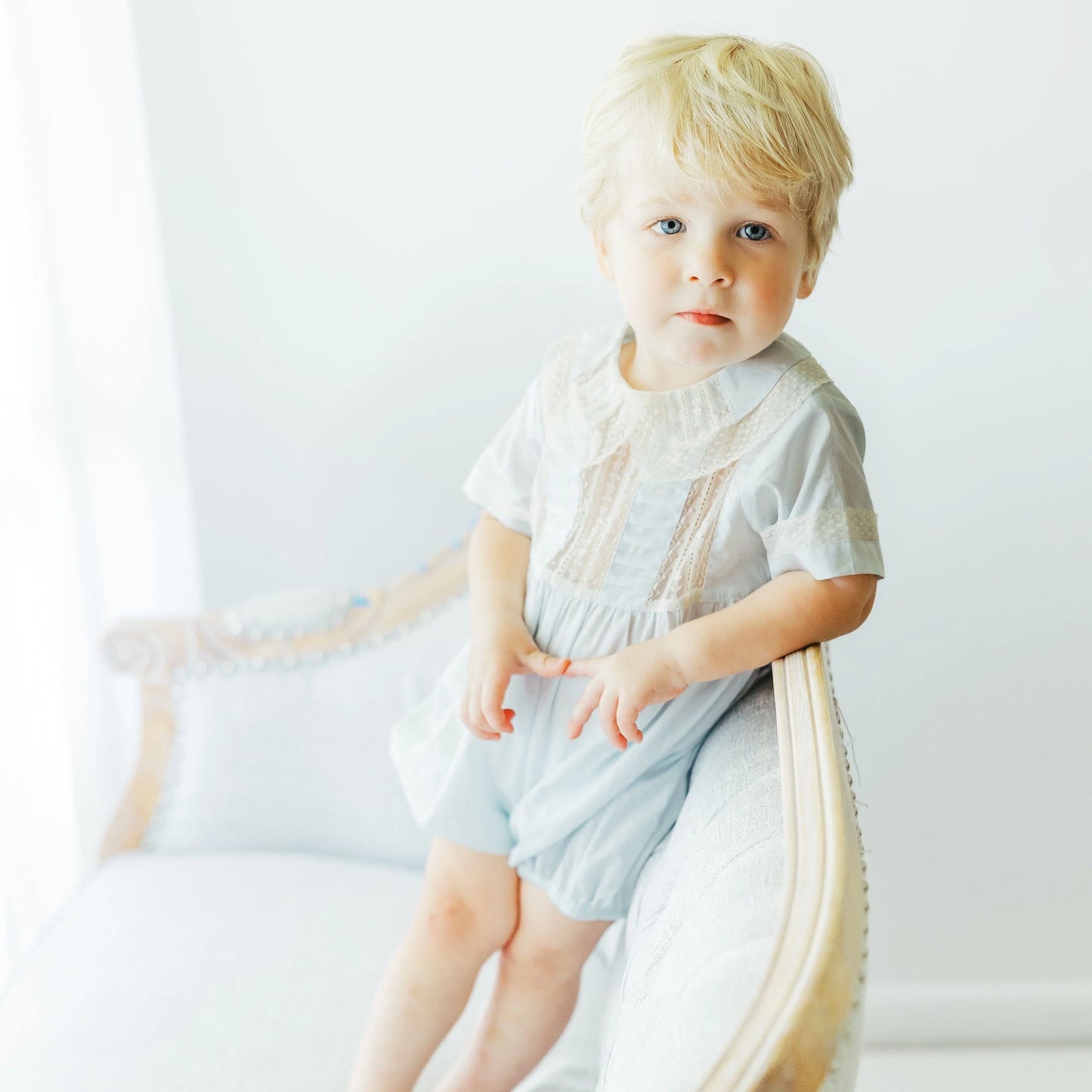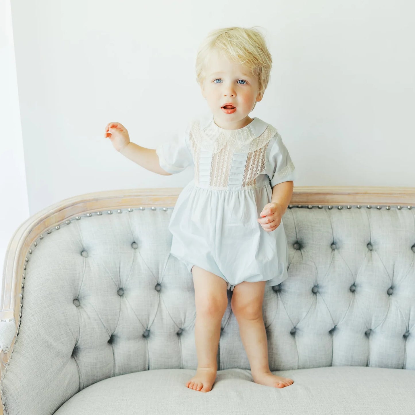 Make every special occasion unforgettable with the Rowan Bubble in blue. This classic heirloom bubble features delicate inlaid floral lace and a timeless silhouette that feels both traditional and charming. Back buttons allow easy dressing, and the soft, machine washable fabric keeps little ones comfortable through celebrations, family photos, and everyday moments of joy. The beautiful blue with ecru lace adds a touch of vintage-inspired style that pairs perfectly with classic accessories and keepsake photography