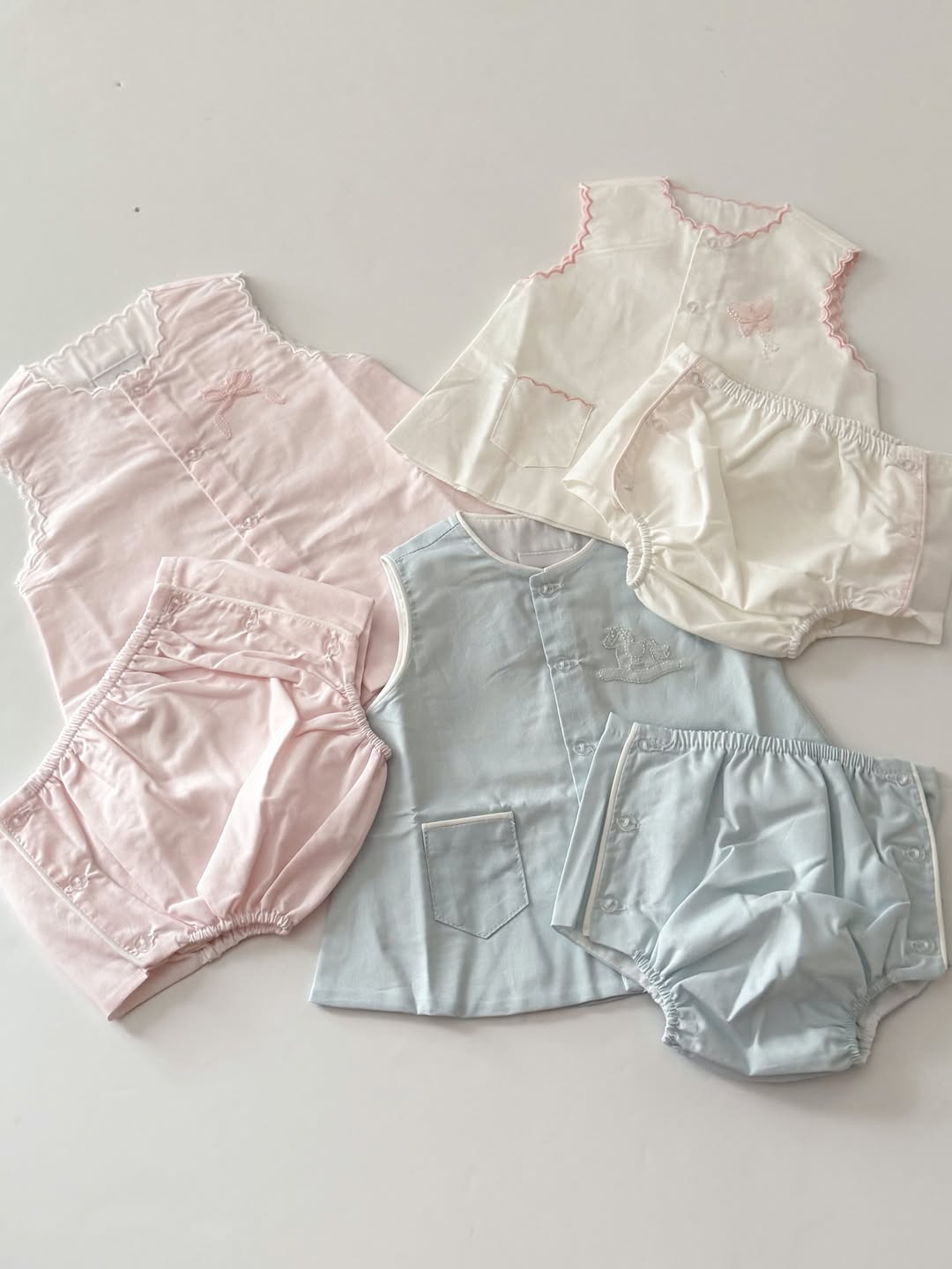 The top features a sweet pink butterfly embroidery, buttons up the front, and is detailed with scalloped embroidered trim along the front pocket, neckline, and arm openings for a sweet, vintage-inspired touch. The matching diaper cover complements the look with coordinating buttons making this set both comfortable and picture-perfect.