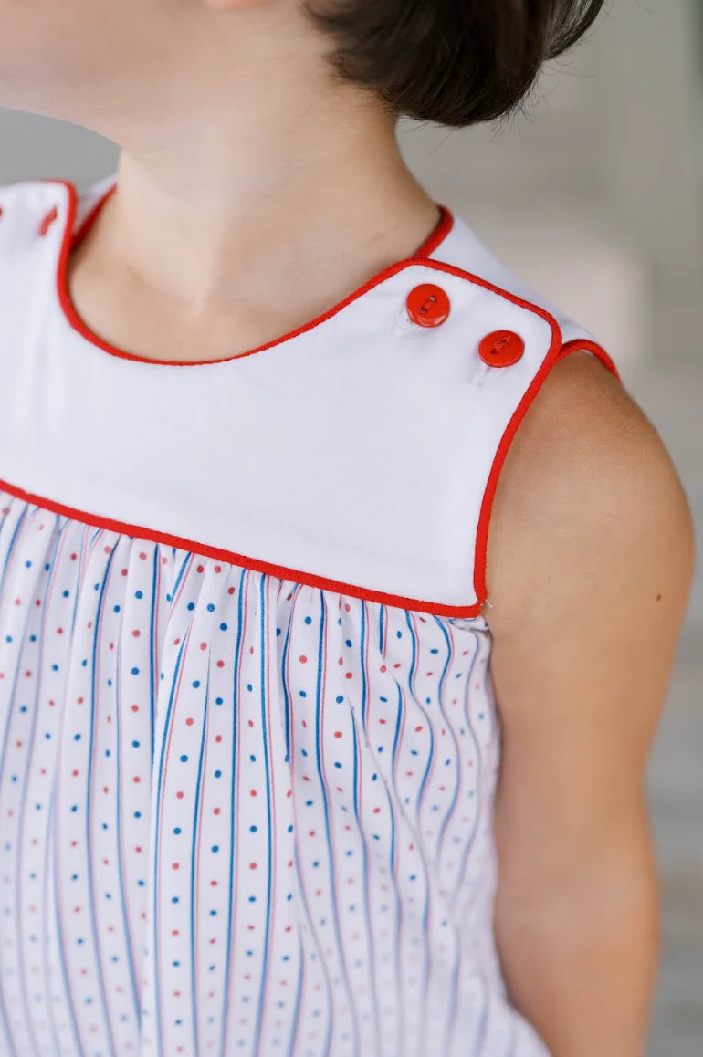 He'll look like the Fourth of July in this patriotic bubble! Just arrived from Lullaby Set, this sweet bubble features the sweetest red, white, and blue pattern, with the cutest collar with red pipping. And we're absolutely obsessed with the sweet matching buttons.