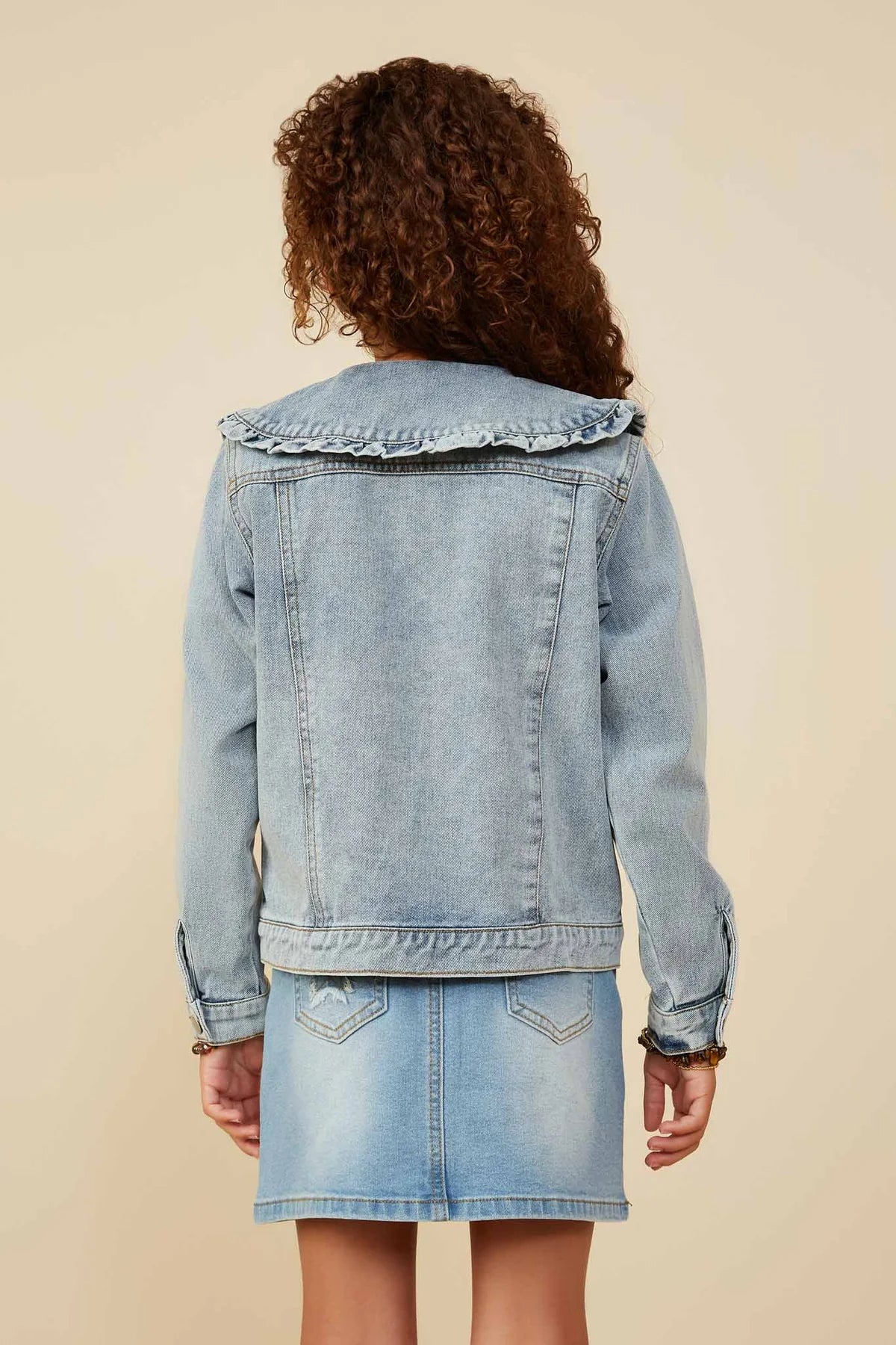 Girls Exaggerated Ruffle Collar Denim Jacket