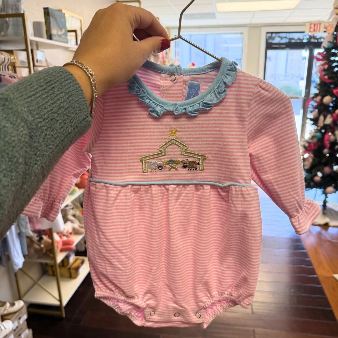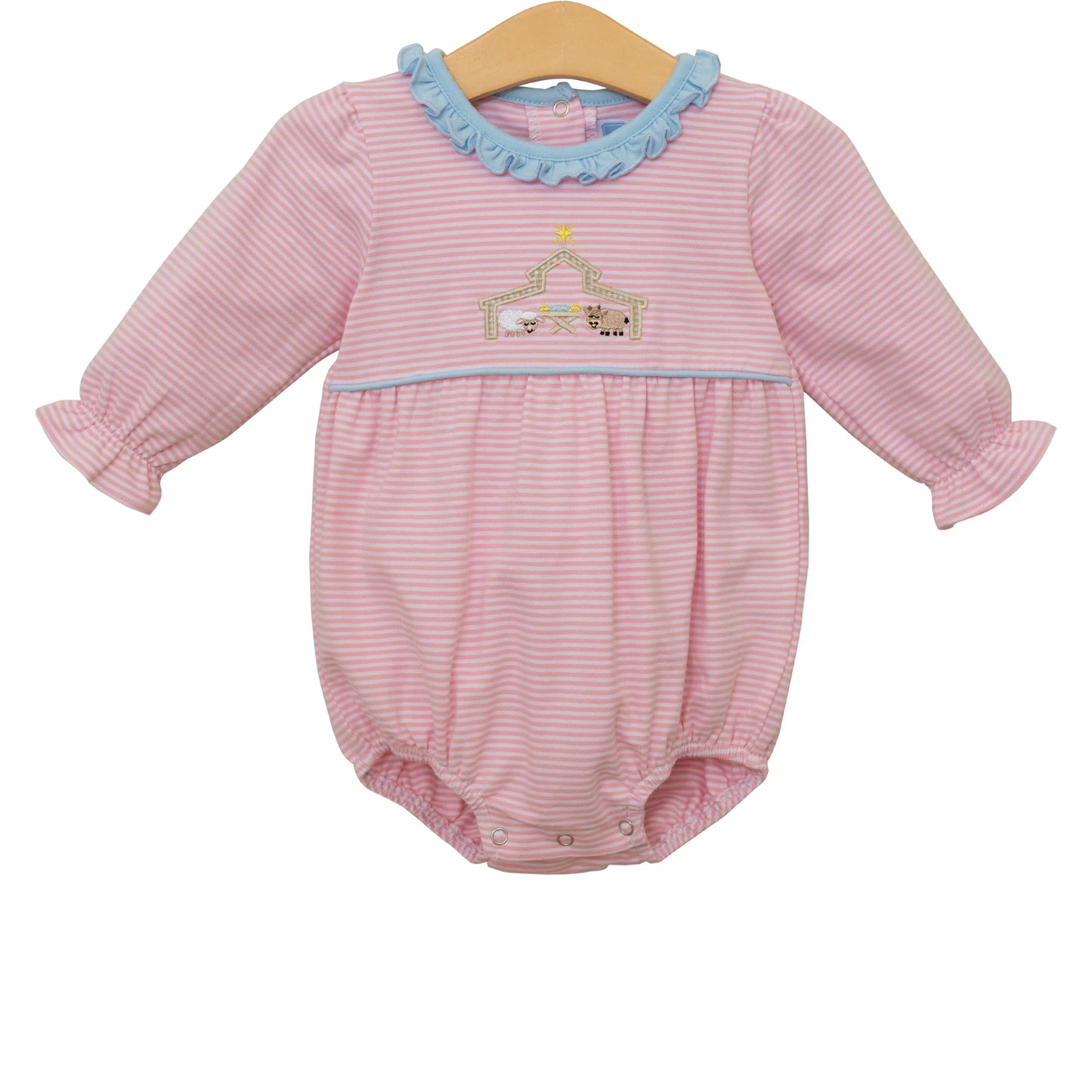 The Nativity Ruffle Bubble from Trotter Street Kids is made from pink and white striped cotton with light blue trim and a hand-embroidered nativity scene across the chest. Ruffled sleeves and a gentle neckline add the perfect girly touch, while snaps at the bottom make it easy for quick changes. A timeless outfit for celebrating the season in comfort and style.